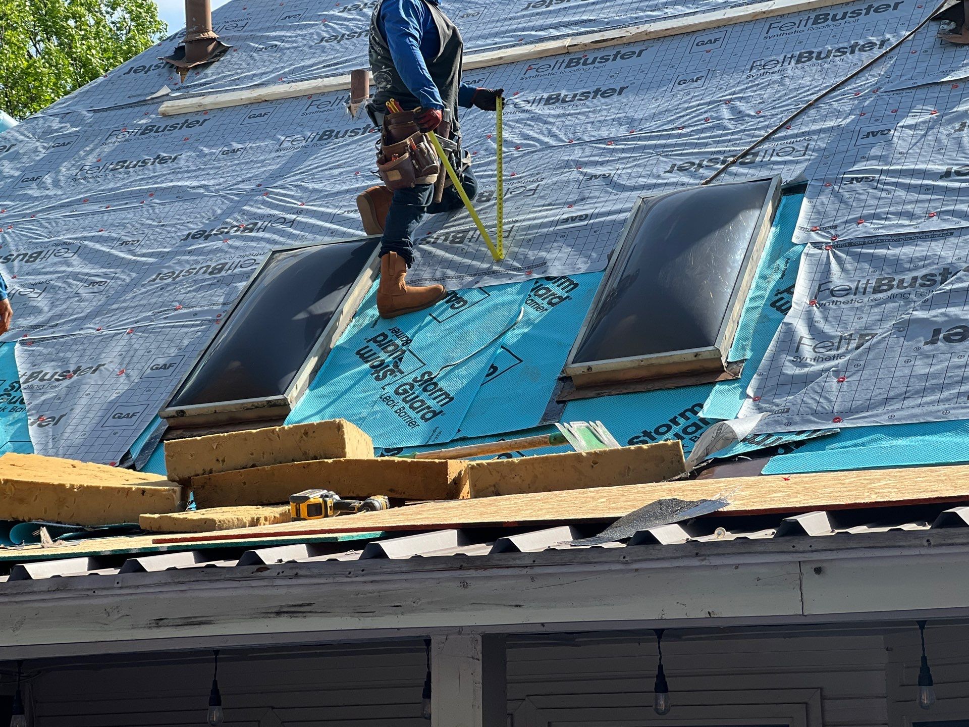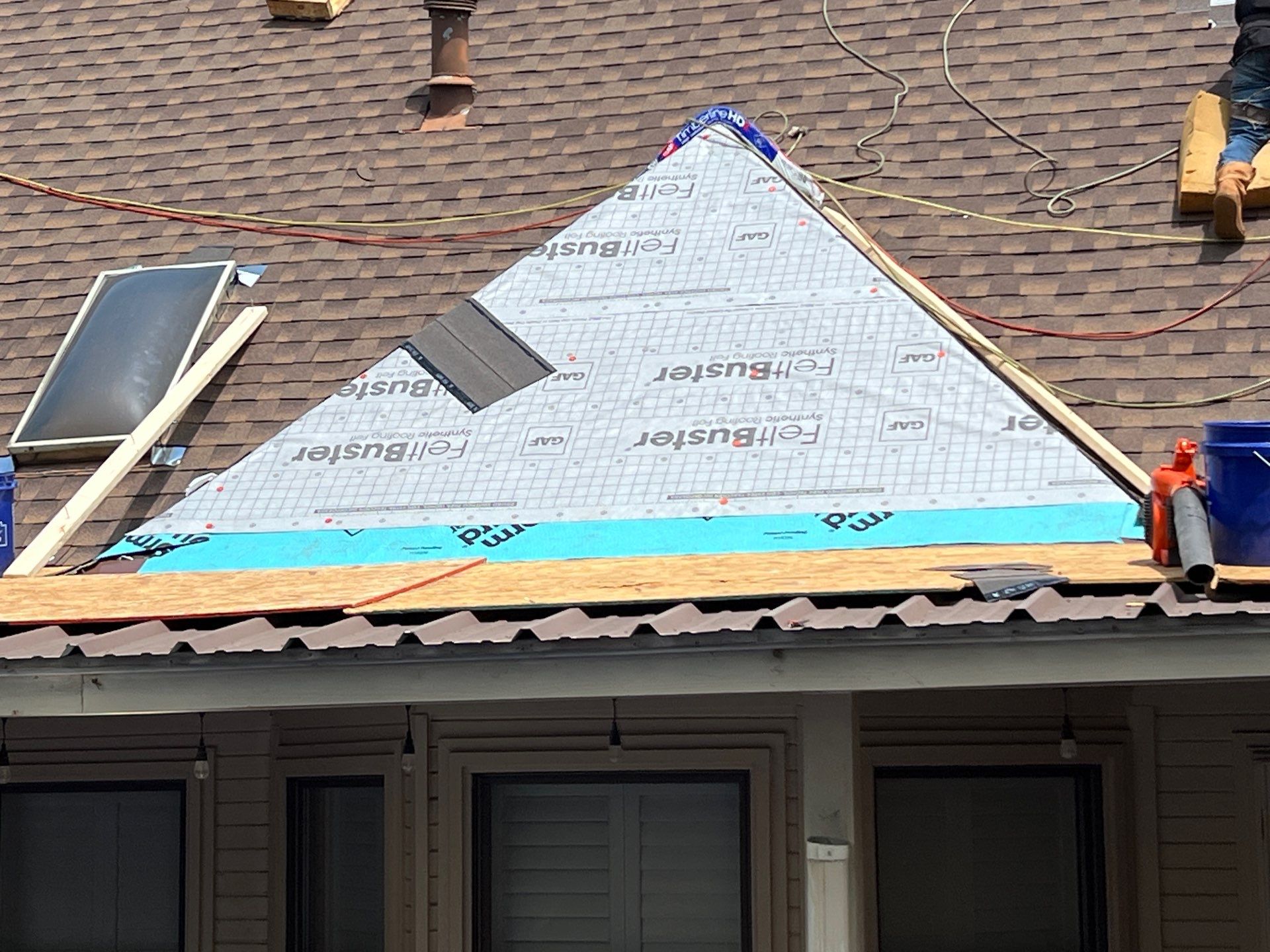 We carefully laid out osb boards across the entire metal roof facet so that there was a sturdy surface on top of it in case shingles or other debris fell down onto it. Doing this with wood is important because just tarping it could still lead to scratching of the metal surface through the tarp.