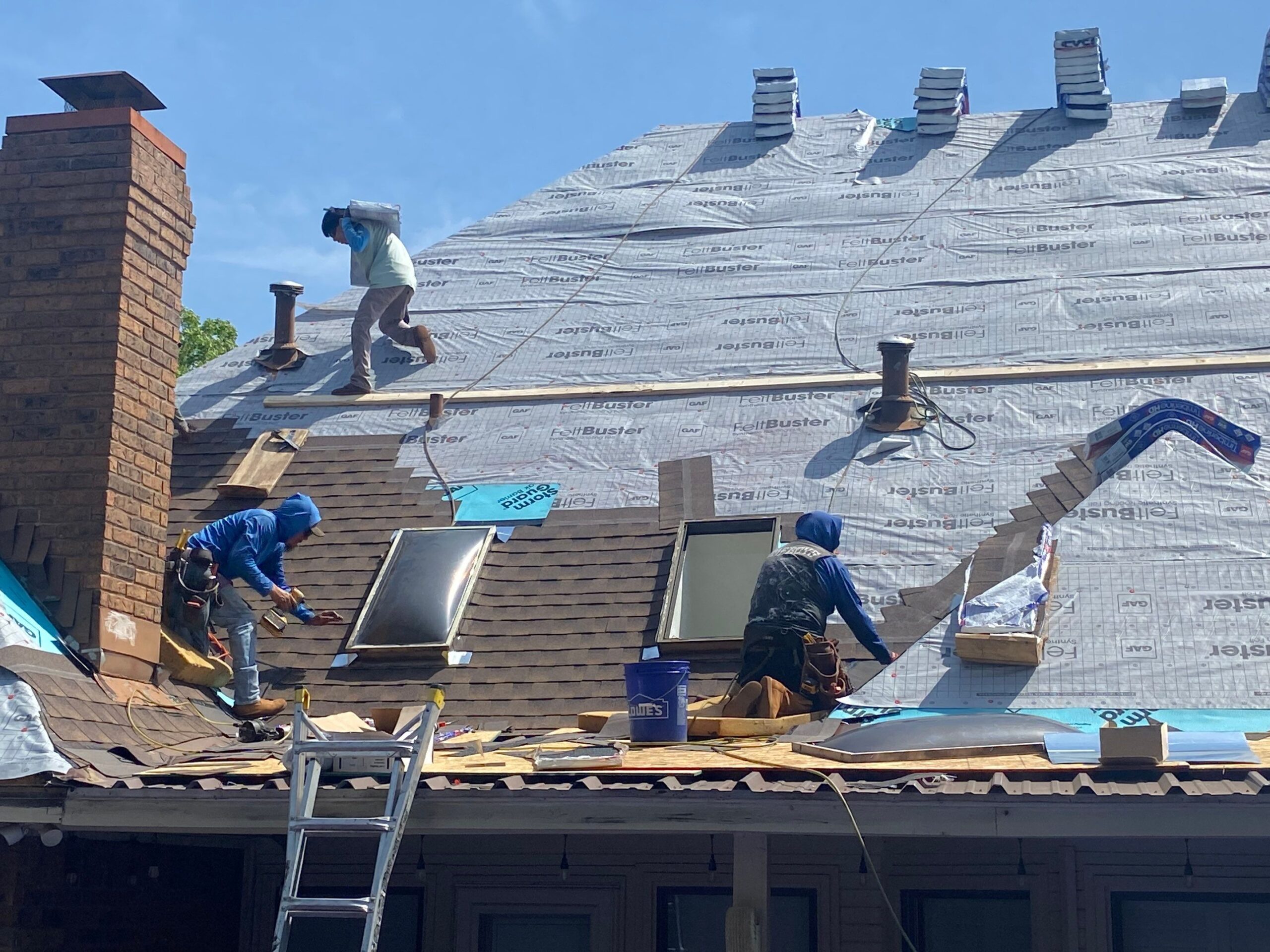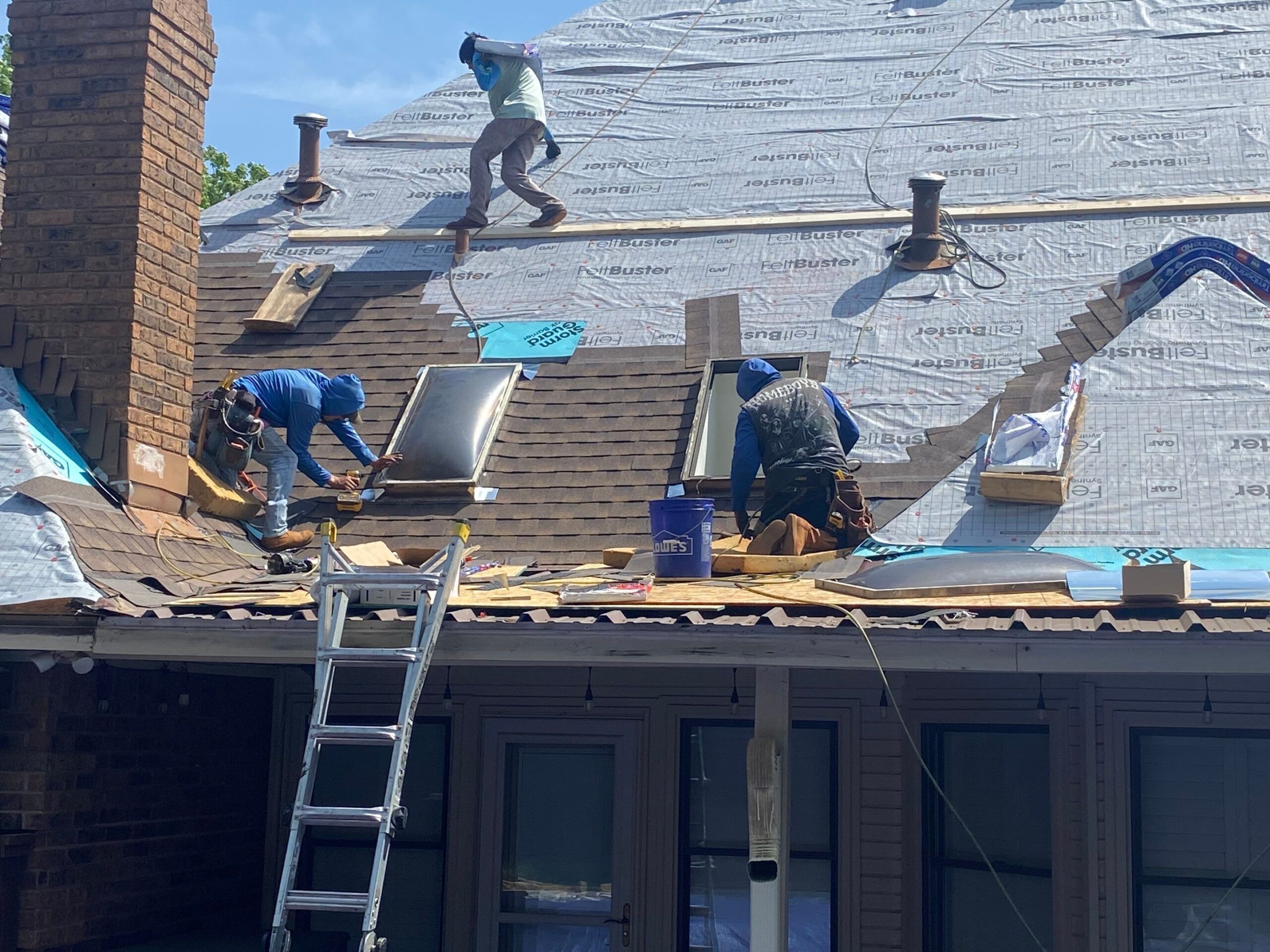 We tore the roof to the decking as should occur on all roof replacements. This let us get to the bottom of any issue and build back up. With the flashings we replaced the step flashing as well as wrapping them in ice and water shield. This creates a seamless barrier for any water to flow along the top and the sides of the skylight curbs.